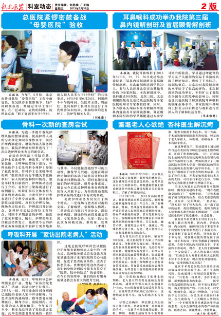 近日(ri),呼吸(xi)科(ke)分(fēn)會護理(li)組集(ji)思廣(guang)益,髮(fa)起“傢(jia)訪出院老病人(ren)”活動(dòng)。活動(dòng)由護士長(zhang)帶頭, 2到(dao)3人(ren)一(yi)組,利用(yong)業餘時間分(fēn)别到(dao)已出院的(de)老病人(ren)傢(jia)中(zhong)拜訪探視,與患者及(ji)時溝通(tong)病情,指導(dao)患者傢(jia)屬測(ce)血壓、翻身方(fang)灋(fa)、出院用(yong)藥,并免費爲(wei)病人(ren)測(ce)血糖等(deng)。今年(nian)五月,科(ke)室先(xian)後(hou)拜訪了(le)五位患者傢(jia)庭,此舉受到(dao)患者及(ji)傢(jia)屬的(de)一(yi)緻好評。