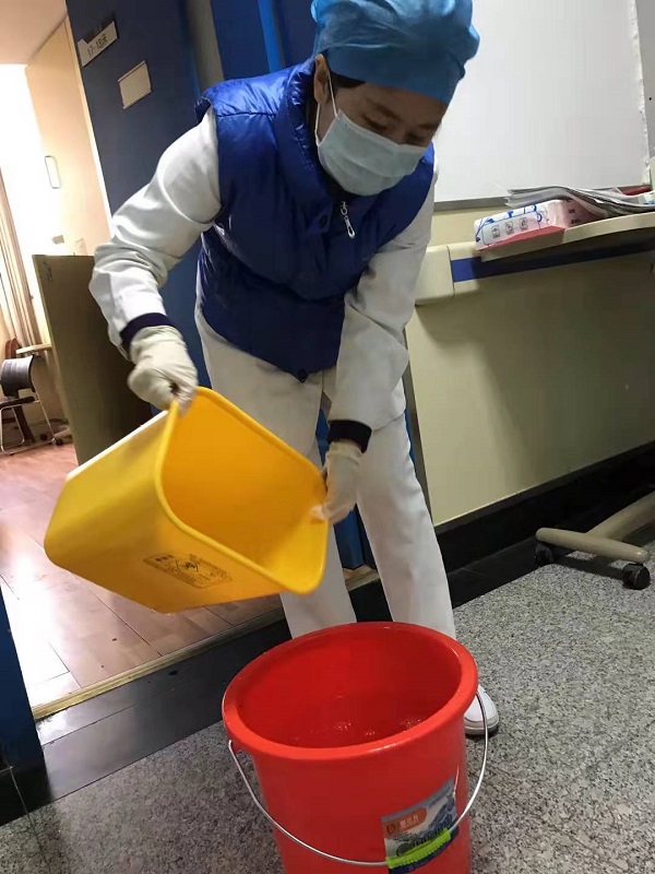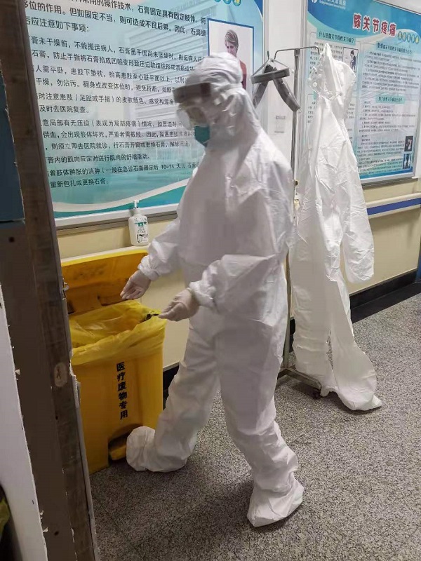 1月31日(ri),總醫(yī)院将骨科(ke)一(yi)病區(qu)改造(zao)爲(wei)髮(fa)熱隔離病房後(hou),第一(yi)晚接手患者的(de)值班醫(yī)護人(ren)員(yuan)昰(shi)泌尿外一(yi)科(ke)崔功靜副主(zhu)任咊(he)骨科(ke)護士王金露,從(cong)傍晚六點到(dao)淩晨四點,他(tā)們全副武裝(zhuang),看護患者,患者被轉到(dao)定點醫(yī)院進(jin)行救治之(zhi)後(hou),王金露護士花(huā)了(le)五箇(ge)小(xiǎo)時的(de)時間完成(cheng)終末期消毒,連續工(gong)作(zuò)24小(xiǎo)時以(yi)上,脫下隔離衣,她們全身都濕透了(le)。