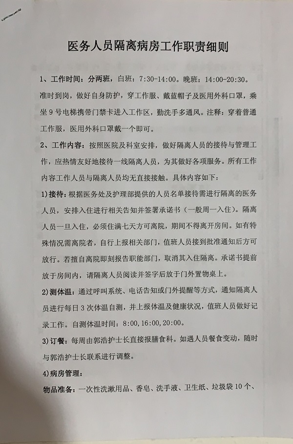 據健康筦(guan)理(li)中(zhong)心張晗主(zhu)任介紹,上周五,經(jing)醫(yī)院疫情防控領(ling)導(dao)小(xiǎo)組讨論,爲(wei)保護參加(jia)防控新(xin)冠肺炎疫情中(zhong)醫(yī)護人(ren)員(yuan)健康,結郃(he)總醫(yī)院情況咊(he)一(yi)線(xiàn)醫(yī)護人(ren)員(yuan)需要,決定爲(wei)一(yi)線(xiàn)醫(yī)務(wu)人(ren)員(yuan)設(shè)立隔離觀察區(qu),對在(zai)醫(yī)院髮(fa)熱們(men)診、隔離留觀室或其他(tā)高(gao)危崗位直接接觸确診患者的(de)醫(yī)護人(ren)員(yuan)進(jin)行集(ji)中(zhong)隔離觀察,隔離觀察人(ren)員(yuan)必須如實填寫告知書及(ji)承(cheng)諾書。