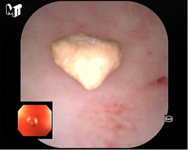 患者李某因慢性腹痛、腹瀉來消化內(nei)科(ke)就診,在(zai)腸鏡檢(jian)查過(guo)程(cheng)中(zhong)髮(fa)現(xian)患者闌尾開口處明顯腫脹、充血,并有(yǒu)白色膿液排(pai)出,進(jin)一(yi)步完善(shan)腹部(bu)CT後(hou)明确診斷(duan)闌尾炎、闌尾糞石嵌頓。征得患者同意後(hou),在(zai)邸雅南(nan)主(zhu)任的(de)帶領(ling)下,張波(bo)副主(zhu)任咊(he)康奎、青勝(sheng)醫(yī)生(sheng)等(deng)團(tuán)隊(duì)成(cheng)員(yuan)通(tong)過(guo)腸鏡活檢(jian)孔道送入“洞察”子(zi)鏡(經(jing)口膽道鏡)進(jin)入闌尾腔,清(qing)晰觀察見到(dao)闌尾腔粘膜明顯充血、糜爛,并見大(da)量膿液,闌尾中(zhong)段狹窄,擴張狹窄後(hou)膽道鏡越過(guo)狹窄段到(dao)達闌尾底部(bu),見一(yi)塊狀黃色闌尾糞石,應用(yong)取石網籃成(cheng)功取出糞石,并将闌尾腔內(nei)全部(bu)糞石殘渣沖洗幹淨。術(shù)後(hou)第二日(ri)腹痛明顯緩解并出院。