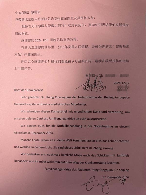 患者傢(jia)屬深受感動(dòng),于(yu)12月17日(ri)特地送來了(le)一(yi)封中(zhong)德(dé)雙語感謝(xiè)信(xin),對醫(yī)護團(tuán)隊(duì)表達了(le)由衷的(de)敬意與感謝(xiè)。信(xin)中(zhong)提到(dao):“有(yǒu)的(de)人(ren)走(zou)進(jin)你的(de)世界裏,會讓你覺得人(ren)間值得,會成(cheng)爲(wei)你的(de)光!你就昰(shi)那束光!”信(xin)中(zhong)真摯的(de)言辭不僅體(ti)現(xian)了(le)傢(jia)屬的(de)感激之(zhi)情,也(ye)展(zhan)現(xian)出國(guo)際(ji)友人(ren)對急診科(ke)醫(yī)護團(tuán)隊(duì)高(gao)度專(zhuan)業性的(de)肯定。