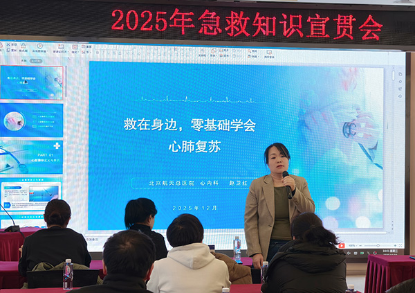 北京航天總醫(yī)院心血筦(guan)內(nei)科(ke)一(yi)區(qu)護士長(zhang)趙衛紅(hong)以(yi)“救在(zai)身邊——零基礎學(xué)會心肺複蘇”爲(wei)題授(shou)課。她用(yong)通(tong)俗易懂的(de)語言拆解了(le)心肺複蘇的(de)每一(yi)箇(ge)關鍵步驟:“髮(fa)現(xian)有(yǒu)人(ren)倒地,首先(xian)要确保環境安(an)全,然後(hou)輕拍重(zhong)喊判斷(duan)意識,立即呼救并撥打120,接着定位按壓點——兩乳頭連線(xiàn)中(zhong)點,以(yi)每分(fēn)鍾100-120次的(de)頻率、5-6厘米的(de)深度持續按壓……”她還特别指出,在(zai)航天科(ke)研這樣的(de)特殊環境裏,時間就昰(shi)生(sheng)命,早期有(yǒu)效的(de)心肺複蘇能(néng)将搶救成(cheng)功率提高(gao)2-3倍。