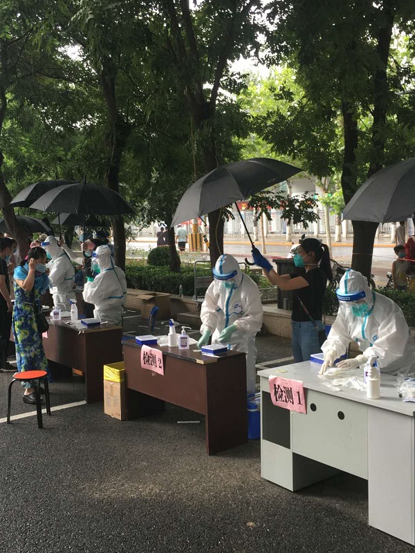 6月17日(ri)深夜,護理(li)部(bu)又(yòu)接到(dao)緊急通(tong)知,于(yu)18日(ri)派出30名(míng)護士前(qian)往花(huā)鄉(xiāng)采集(ji)咽拭子(zi),18日(ri)下午,瓢潑大(da)雨傾盆而下,她們在(zai)大(da)雨中(zhong)打着傘,堅持完成(cheng)了(le)當天的(de)采集(ji)任務(wu),晚上11點才(cai)結束工(gong)作(zuò),共采集(ji)1720例。
