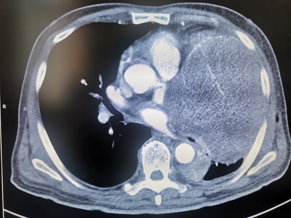 該患者爲(wei)一(yi)名(míng)老年(nian)男性,76歲,因進(jin)行性加(jia)重(zhong)胸悶、喘憋前(qian)來就診,經(jing)CT檢(jian)查髮(fa)現(xian)左側胸腔內(nei)巨大(da)占位,直徑達20cm以(yi)上,幾乎占據整箇(ge)左側胸腔,明顯壓迫心髒咊(he)肺部(bu)組織,并已經(jing)導(dao)緻大(da)量胸腔積液出現(xian)。如果不及(ji)時切除腫瘤,患者可(kě)能(néng)很(hěn)快就會出現(xian)心、肺功能(néng)衰竭(jie),可(kě)以(yi)說昰(shi)命懸一(yi)線(xiàn)。