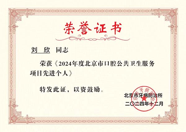 在(zai)2024年(nian)度北京市(shi)公(gōng)共衛生(sheng)項(xiang)目(mu)先(xian)進(jin)單(dan)位及(ji)先(xian)進(jin)箇(ge)人(ren)的(de)評比中(zhong),我(wo)院口腔科(ke)及(ji)口腔科(ke)副主(zhu)任劉欣分(fēn)别獲得了(le)“2024年(nian)度北京市(shi)口腔公(gōng)共衛生(sheng)服務(wu)項(xiang)目(mu)先(xian)進(jin)單(dan)位“及(ji)“2024年(nian)度北京市(shi)口腔公(gōng)共衛生(sheng)服務(wu)項(xiang)目(mu)先(xian)進(jin)箇(ge)人(ren)“的(de)榮譽!