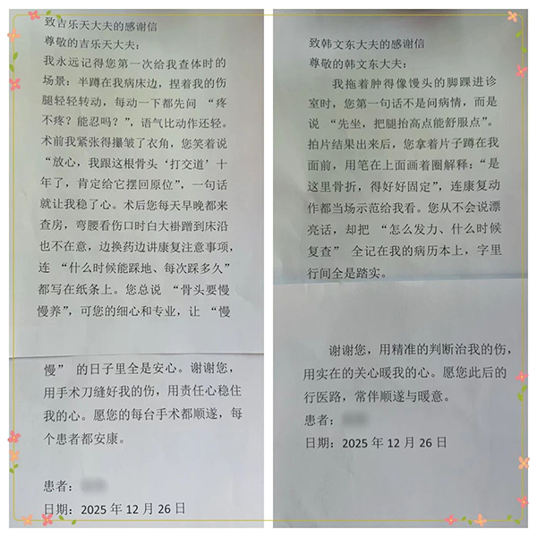 郭先(xian)生(sheng)在(zai)信(xin)中(zhong)特别感謝(xiè)了(le)主(zhu)筦(guan)醫(yī)生(sheng)吉樂天大(da)夫與韓文(wén)東大(da)夫。他(tā)回憶起術(shù)前(qian)吉大(da)夫半蹲牀(chuang)邊、輕聲細語的(de)查體(ti),一(yi)句“放心,我(wo)跟這根骨頭‘打交道’十年(nian)了(le)”瞬間穩住了(le)他(tā)緊張的(de)心。術(shù)後(hou),吉大(da)夫嚴謹細緻的(de)每日(ri)查房、清(qing)晰的(de)康複指導(dao)紙條,讓康複之(zhi)路每一(yi)步都走(zou)得安(an)心。而韓文(wén)東大(da)夫在(zai)初診時,面對她腫痛的(de)腳踝,第一(yi)句關切的(de)話(hua)語、耐心詳盡的(de)病情解釋與當場(chang)示範的(de)康複動(dòng)作(zuò),則讓他(tā)感受到(dao)了(le)醫(yī)術(shù)之(zhi)外的(de)人(ren)文(wén)關懷。兩位醫(yī)生(sheng)用(yong)紮實的(de)專(zhuan)業技(ji)術(shù)咊(he)設(shè)身處地的(de)共情,精(jīng)準地治愈了(le)郭先(xian)生(sheng)身體(ti)的(de)傷,也(ye)溫暖了(le)他(tā)的(de)心。